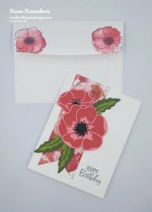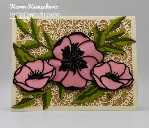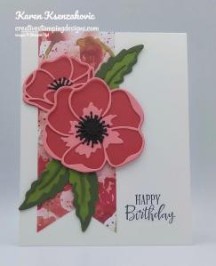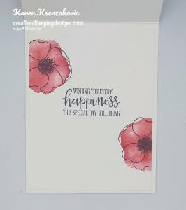 I adhered the sentiment to the card front using Stampin’ Dimensionals. I adhered the Distressed Gold outline flowers to the solid stamped flowers using Multipurpose Liquid Glue. I adhered the flowers to the card front using Stampin’ Dimensionals. I cut the top 3 leaves off the leave stems from the Poppy Moments Dies and adhered them under the flowers using Multipurpose Liquid Glue. I adhered the Fine Shimmer leaves under the flowers using Multipurpose Liquid Glue. I adhered 1 of the small outlined Distressed Gold flowers to the card front using Multipurpose Liquid Glue. I added a Brushed Metallic Adhesive-Backed Dot to the sentiment. I added an Elegant Faceted Gem to the flower centers.