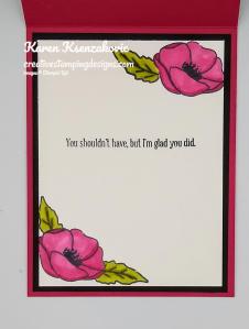 On the inside, I stamped the sentiment from Season of Chic stamp set in Soft Succulent Ink on a panel of Basic White. I adhered the die cut flowers to the bottom of the panel. I cut apart one of the die cut leaves and adhered them under the flowers. I adhered the Basic Whtie panel to a Petal Pink mat then to the inside of the Soft Succulent card base.