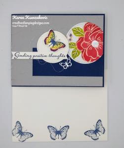 On the inside I stamped the sentiment from the Positive Thoughts stamp set in Night of Navy Ink on a panel of Basic White cardstock. I stamped the butterfly image from the Positive Thoughts stamp set in Coastal Cabana Ink on the panel. I adhered the Basic White panel to a Night of Navy mat using Stampin’ Seal and then to the inside of the Thick Basic White card base using Multipurpose Liquid Glue.
