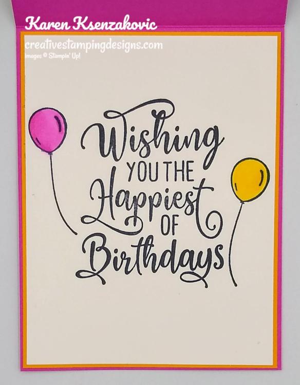 On the inside I stamped 2 of the sentiments from the Nothing’s Better Than stamp set in Night of Navy Ink on a Basic White panel. I stamped the sentiment from the Stampin’ Up! Peaceful Moments Cling Stamp Set in Night of Navy Ink below the other 2. I stamped the cocktail glass image from the Nothing’s Better Than stamp set in Tuxedo Black Ink on the bottom of the panel and stamped the fill images the same as I did for the card front. I adhered the Basic White panel to a Magenta Madness mat using Stampin’ Seal and then to the inside of the Night of Navy card base using Multipurpose Liquid Glue.