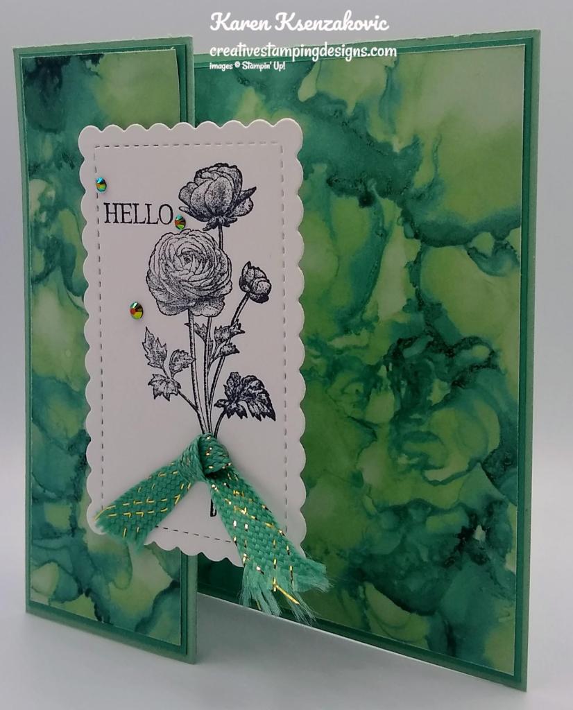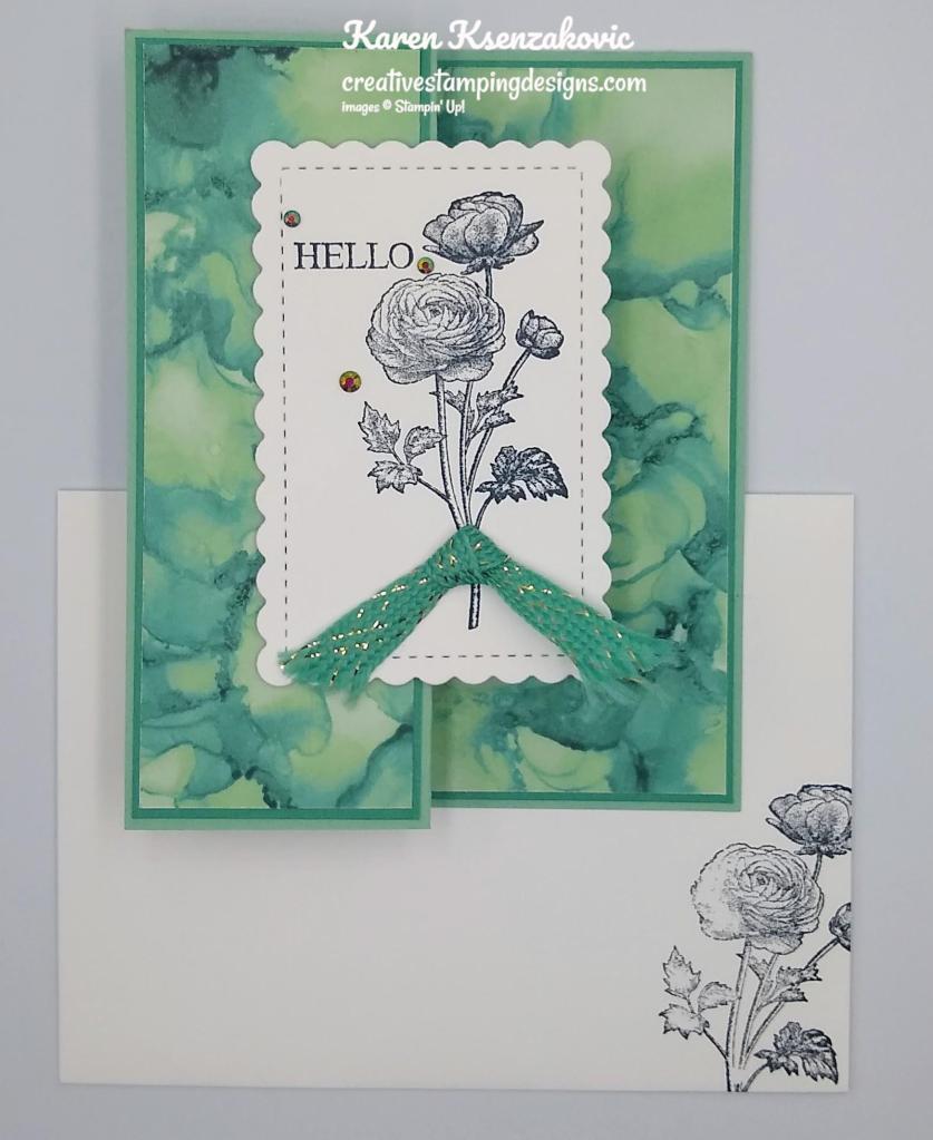 On a panel of Basic White cardstock, I stamped the rose image from the Ranunculus Romance stamp set in Smoky Slate Ink. I colored the image using my Mint Macaron and So Saffron Stampin’ Blends Markers. I cut the image our using my Ranunculus Dies. I adhered the die cut rose to the embossed hexagon using Stampin’ Dimensionals.