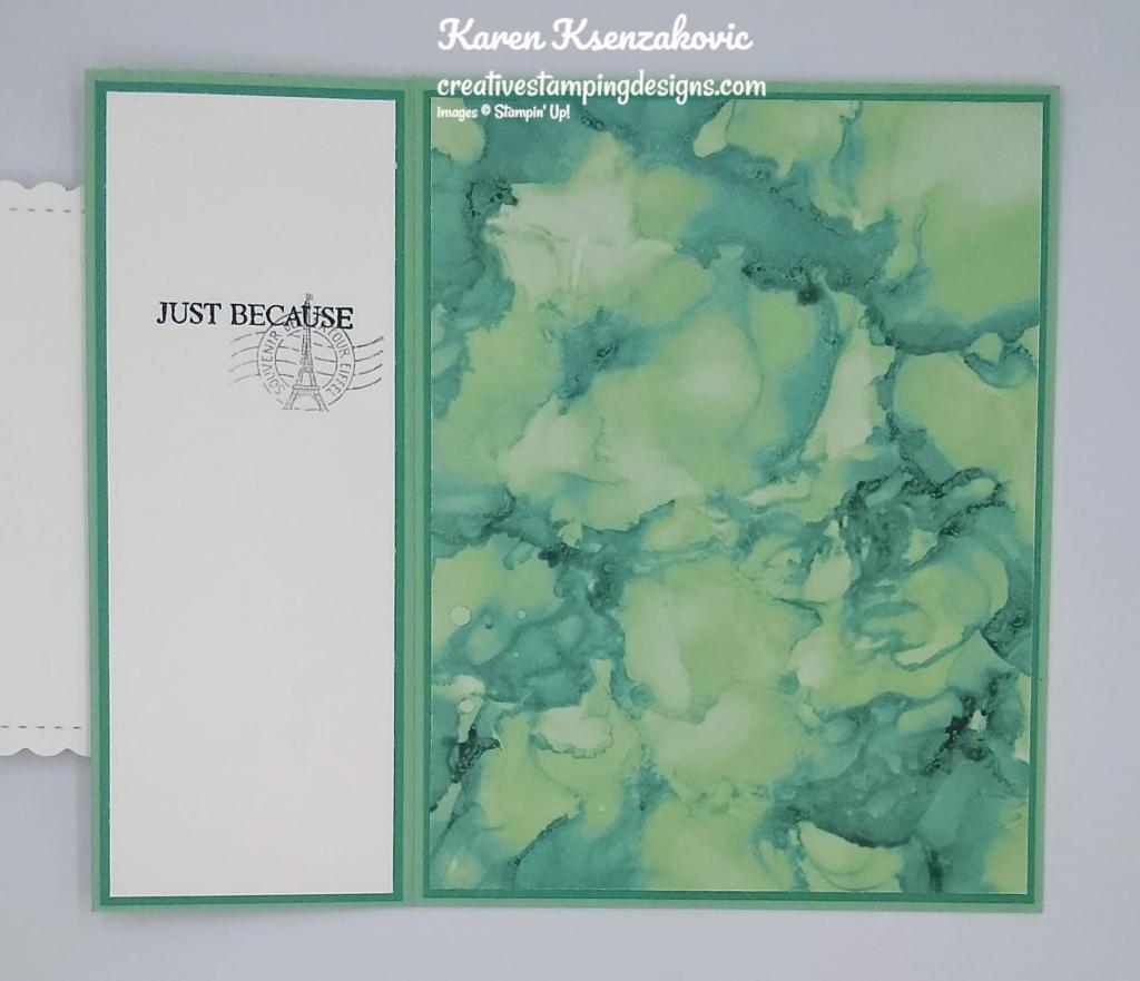 On the inside, I stamped the sentiment from the Ranunculus Romance stamp set in Smoky Slate Ink on a Basic White panel. I stamped the rose image from the Ranunculus Romance stamp set on the bottom of the panel in Smoky Slate Ink. I colored the image using my Mint Macaron and So Saffron Stampin’ Blends Markers. I adhered the Basic White panel to a Smoky Slate mat then to the inside of the Mint Macaron card base.