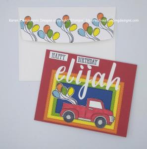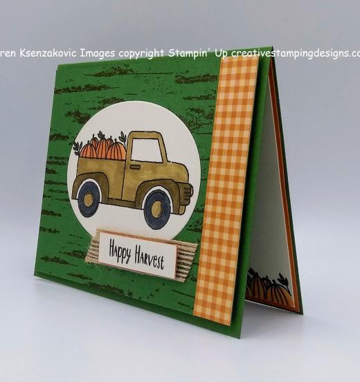To finish my card I decorated a Medium Whisper White Envelope. I stamped the truck and pumpkin images in from the Ride With Me stamp set on the envelope front in Tuxedo Black Memento Ink. I colored the images in the same as I did for the card. I adhered a panel of the Come To Gather DSP to the envelope flap.