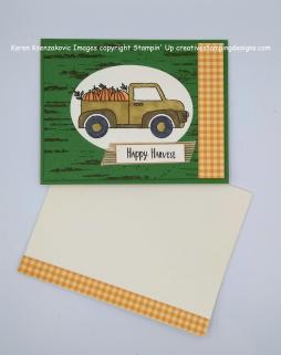 On a panel of Whisper White cardstock I stamped the truck image from the Ride With Me stamp set in Tuxedo Black Memento Ink. I stamped the pumpkin image from the Ride With Me stamp set in the back of the truck in Tuxedo Black Memento Ink. I colored the images in using my Basic black, Gray Granite, Old Olive and Pumpkin Pie Stampin’ Blends Markers. I adhered the artwork to an Early Espresso mat using Snail. I adhered the matted artwork to the card front using Stampin’ Dimensionals.