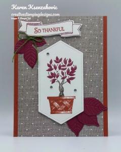 On a small panel of Very Vanilla cardstock, I stamped the tree trunk image from the Stampin’ Up! Rooted Ink Nature Cling Stamp Set in Crumb Cake Ink, stamping off once. I cut the image out using the circle from the Stitched Shapes Dies. I stamped the sentiment from the Life Is Beautiful stamp set in Crumb Cake Ink towards the top of the circle and adhered it to the very vanilla panel using Multipurpose Liquid Glue. I cut 2 leaves out using the Gathered Leaves Dies, 1 in Cherry Cobbler and 1 in Brushed Metallic paper. I adhered the leaves to the tree trunk image using Glue Dots. I made a triple bow using Linen Thread and adhered it to the leaves using a Glue Dot. I adhered the artwork to the card front using Stampin’ Dimensionals. I added a few Cherry Cobbler Holiday Rhinestone Basic Jewels to the card front.