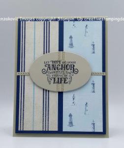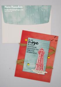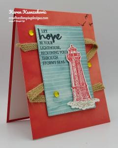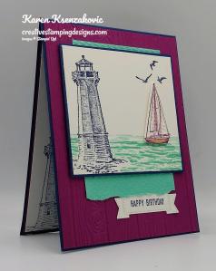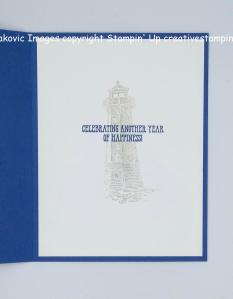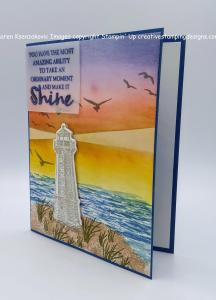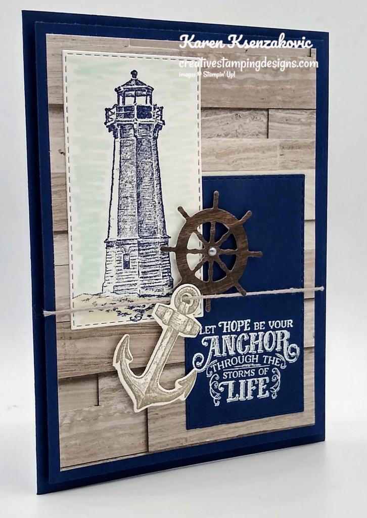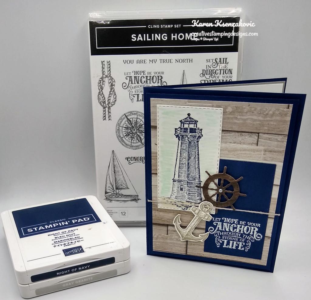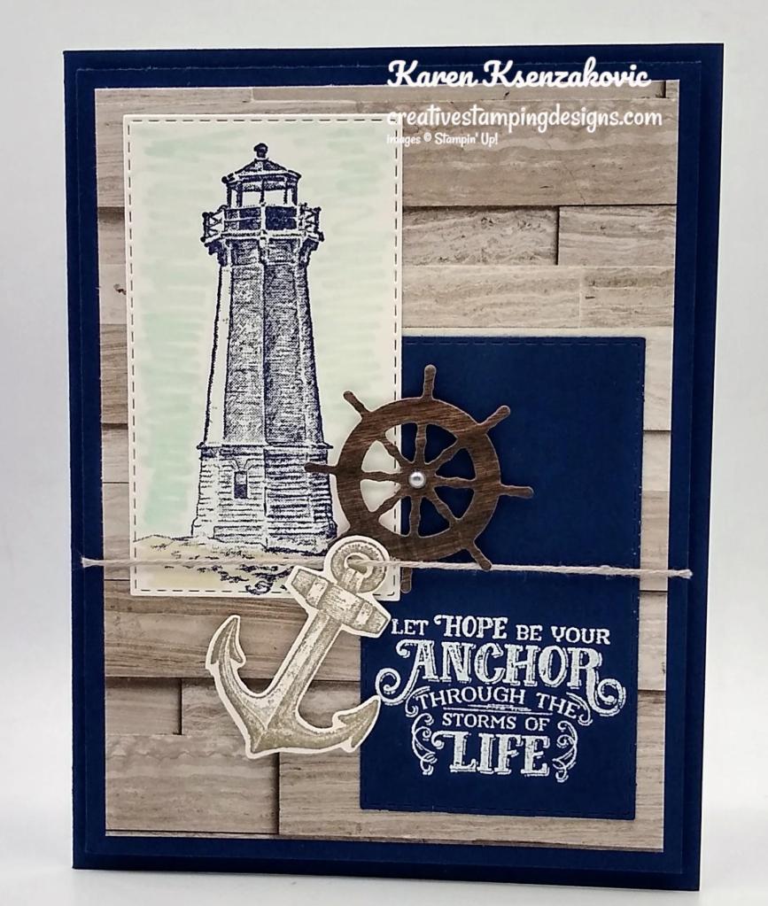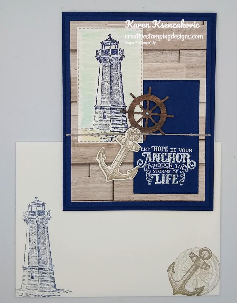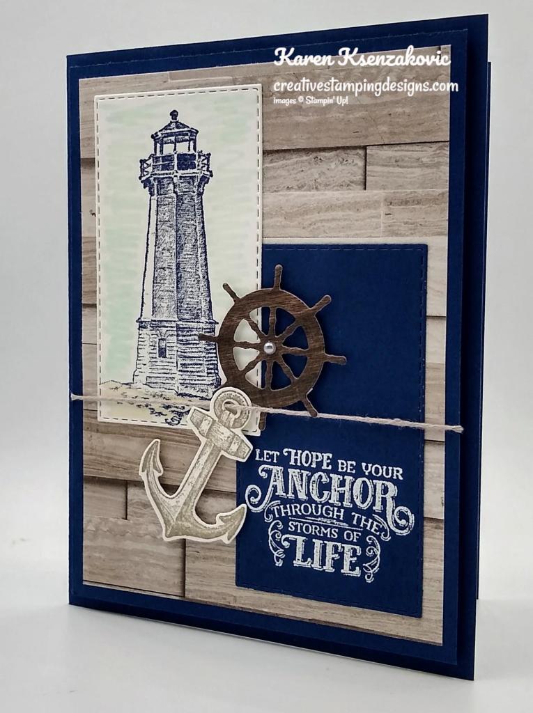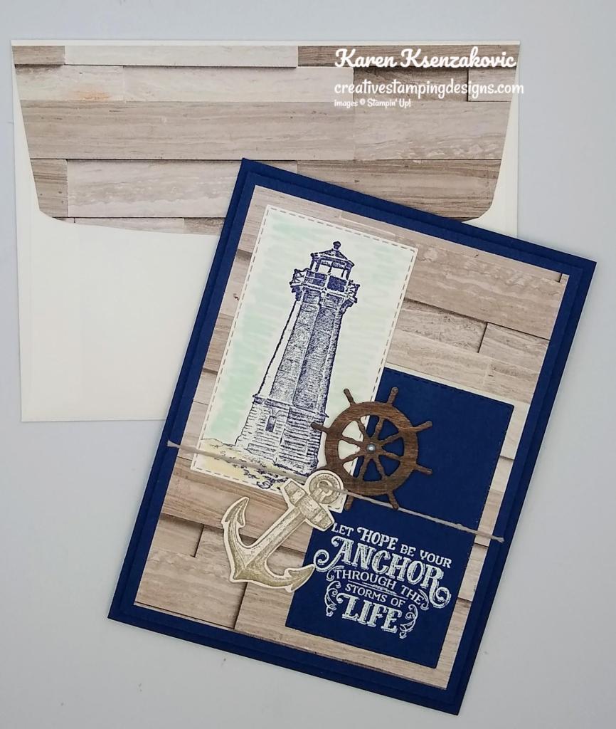 On a panel of Basic White cardstock I stamped the lighthouse image from the Sailing Home stamp set in Night of Navy Ink. I masked the lighthouse with a sticky note and added color to the backgrounds using my Blending Brushes. I added Coastal Cabana Ink on the top of the panel and Smoky Slate Ink on the bottom of the image. I stamped the bird image from the Sailing Home stamp set on the top of the panel in Night of Navy Ink. I stamped the sentiment from the Stampin’ Up! Through It Together Cling Stamp Set next to the lighthouse image in Night of Navy Ink. I cut the image out using my Stitched Rectangle Dies. I adhered the artwork to a Night of Navy mat using Stampin’ Seal and then to the card front using Stampin’ Dimensionals.