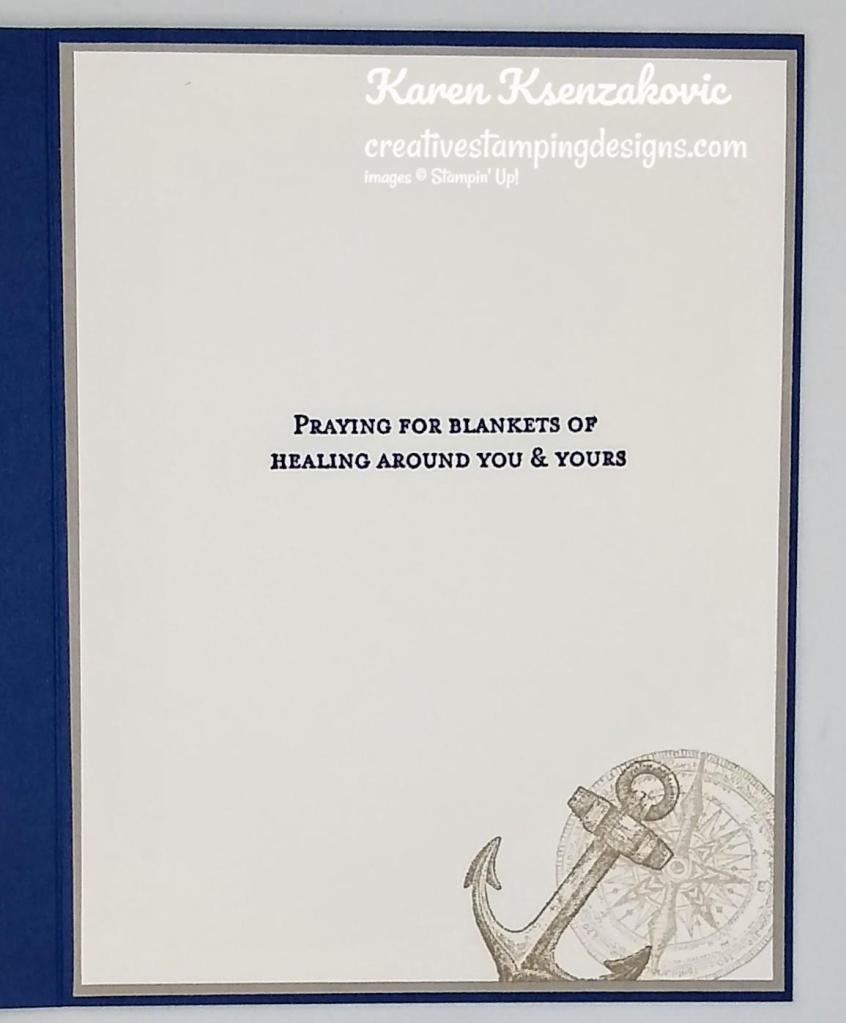 On the inside I stamped the sentiment from the Sailing Home stamp set in Night of Navy Ink on a Basic White panel. I stamped the sand dollar image from the Friends Are Like Seashells stamp set in Smoky Slate Ink on the bottom of the panel. I stamped the other seashells in Calypso Coral Ink. I adhered the Basic White panel to a Smoky Slate mat using Stampin’ Seal and then to the inside of the Night of Navy card base using Multipurpose Liquid Glue.