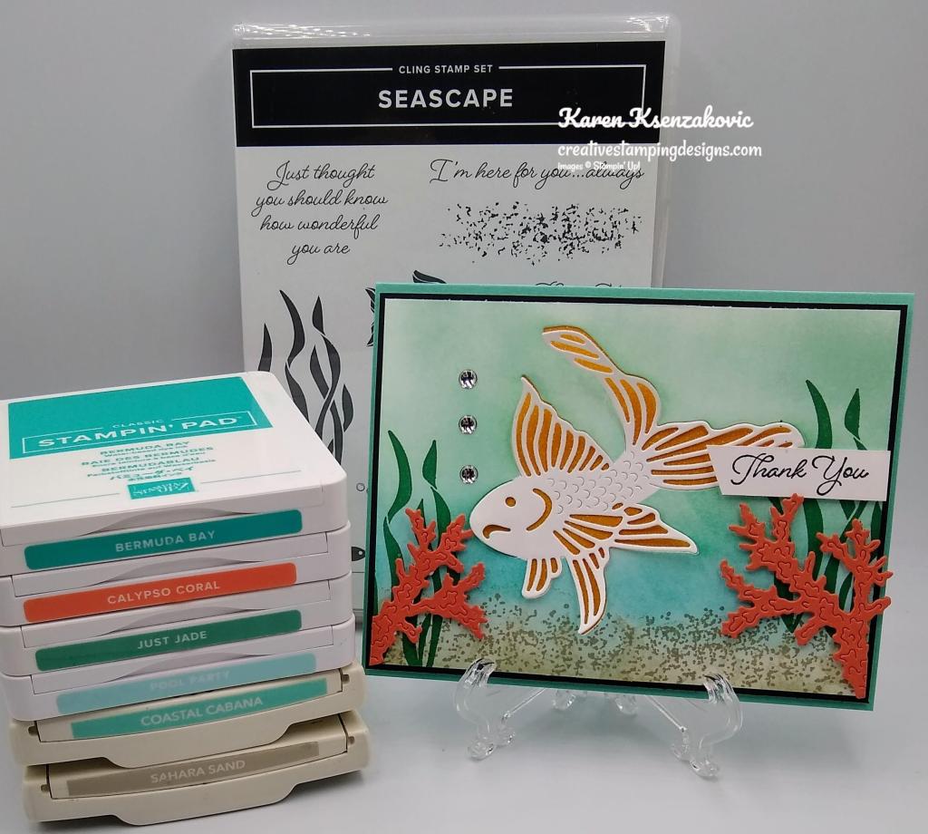 I used the Stampin’ Up! Seascape Bundle along with the Expressions In Ink Designer Series Paper and the Diorama Dies.