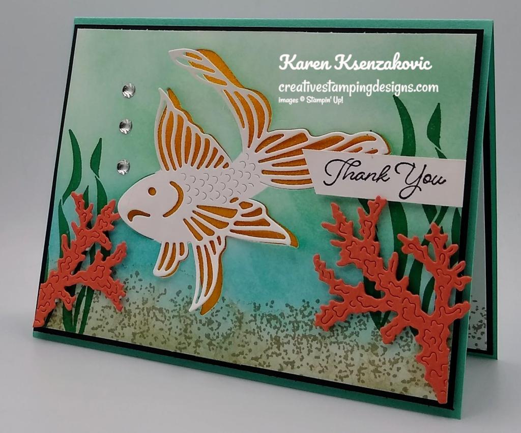 I stamped the school fish image from the Seascapes stamp set in Shaded Spruce Ink on the Shaded Spruce panel and Pear Pizzazz Ink on the Pear Pizzazz panel of cardstock. I cut the panel of Pear Pizzazz cardstock and the panel of Shaded Spruce cardstock using the Layering Diorama Dies (cutting the shaded spruce with the larger one). I adhered the Shaded Spruce panel on top of the Pear Pizzazz panel using Stampin’ Seal. I adhered the layered panel to the card front using Stampin’ Dimensionals. From a panel of the Gold Metallic Specialty Paper I cut the large fish image using the Sea Life Dies. I adhered the fish to the center of the card front using Stampin’ Dimensionals.