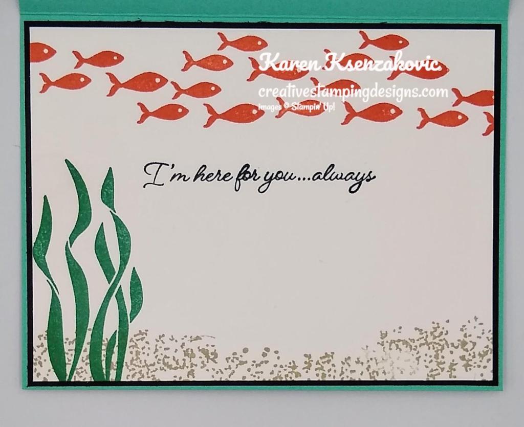 On the inside I stamped the seaweed image from the Seascape stamp set in Shaded Spruce Ink, stamping off once, on the bottom of a Basic White panel. I stamped the seaweed image again in Pear Pizzazz Ink over the Shaded Spruce image. I stamped the fish image from the Seascape stamp set in Crumb Cake Ink on the bottom of the panel. I stamped the sentiment from the Stampin’ Up! Best Year Cling Stamp Set on Shaded Spruce Ink in the center of the panel. I adhered the Basic White panel to a Pear Pizzazz mat using Stampin’ Seal and then to the inside of the Shaded Spruce card base using Multipurpose Liquid Glue.