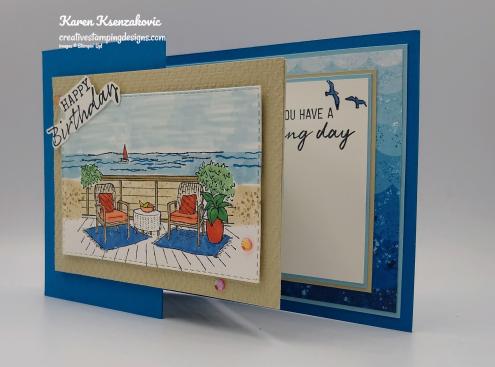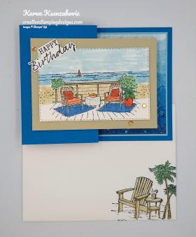 For today I have something a little different for you. I have the same card one for Beginner Stampers and one for the Casual Stamper. For those of you that know me, you know that one of my favorite things to do is walk the beach and collect shells. I have a big curio cabinet full of them, all kinds all shape. I don’t like just perfect shells, I like all the pieces that I can find too. Here are the cards.