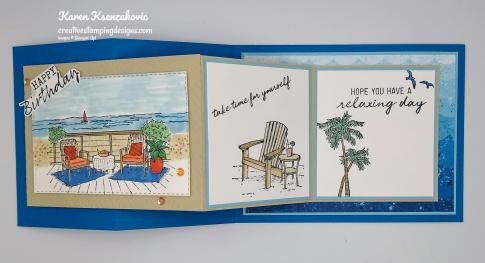 On the inside of both I stamped the sentiment from the Best Year stamp set in Soft Suede Ink in the center of Whisper White panels. I stamped the sand image from the Seaside Notions stamp set across the bottom of the panels in Soft Suede Ink, stamping off once. I stamped the larger shell from the Seaside Notions stamp set in Soft Suede Ink on the bottom of the panels and colored them in using my Petal Pink Stampin’ Blends Markers.
