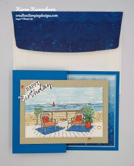 To finish my card I decorated Medium Whisper White Envelopes. I only have the Casual Stamper card in the above photos since the envelopes were identical. I stamped the sand image from the Seaside Notions stamp set in Soft Suede Ink, stamping off once, across the bottom of the envelope front and envelope flap multiple times. I stamped the shell images from the Seaside Notions stamp set in Soft Suede Ink on the envelope front and flap and colored them in using my Balmy Blue, Petal Pink and Soft Sea Foam Stampin’ Blends Markers.