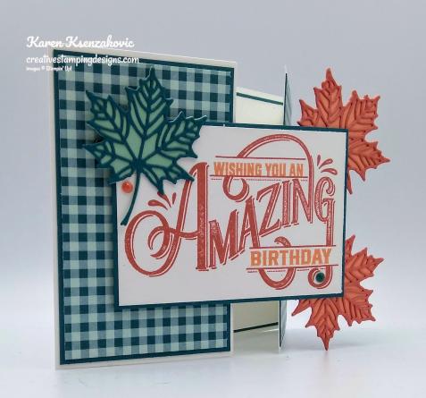 I stamped the large leaf image from the Stampin’ Up Gather Together Photopolymer Stamp Set in Versamark Ink on a panel of So Saffron Vellum from the Perennial Essence 12″ X 12″ Vellum Cardstock. I immediately sprinkled it with my Copper Stampin’ Emboss Powder and set it using my Heat Tool. I cut the leaf out using the Gathered Leaves Dies. I cut out Cajun Craze, Pumpkin Pie and So Saffron leaves using the Gathered Leaves Dies. I cut out a Cajun Craze/Pumpkin Pie leaf using the Seasonal Layers Dies. I arranged the leaves how I wanted them and adhered them to the card front using Glue Dots and Stampin’ Dimensionals. I added a Cajun Craze Linen Thread Bow from the Come To Gather Ribbon Combo Pack under the leaves using a Glue Dot.