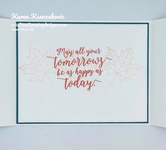 On the inside I stamped the sentiment from the Gather Together stamp set in Basic Gray Ink to the center of a Very Vanilla panel. I stamped the small leaf image from the Stampin’ Up Colorful Seasons Photopolymer Stamp Set in Cajun Craze, Pumpkin Pie and So Saffron Ink to the bottom of the panel. I adhered the Very Vanilla panel to the inside of a Basic Gray card base using Multipurpose Liquid Glue.