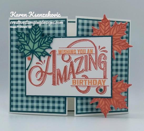 On the inside I stamped the sentiment from the Gather Together stamp set in Basic Gray Ink to the center of a Very Vanilla panel. I stamped the small leaf image from the Stampin’ Up Colorful Seasons Photopolymer Stamp Set in Cajun Craze, Pumpkin Pie and So Saffron Ink to the bottom of the panel. I adhered the Very Vanilla panel to the inside of a Basic Gray card base using Multipurpose Liquid Glue.