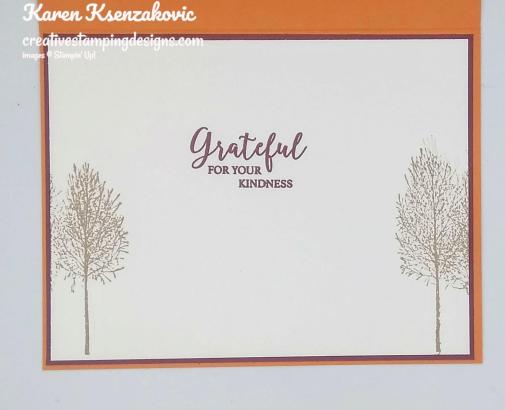 On the inside I stamped the tree image from the Winter Woods stamp set in Crumb Cake Ink on either side of a Whisper White panel. I stamped the sentiment from the Stampin’ Up! Seasonal Wreath Photopolymer Stamp Set in Merry Merlot Ink in top center of the panel. I adhered the Whisper White panel to a Merry Merlot mat using Snail and then to the inside of the Pumpkin Pie card base using Multipurpose Liquid Glue.