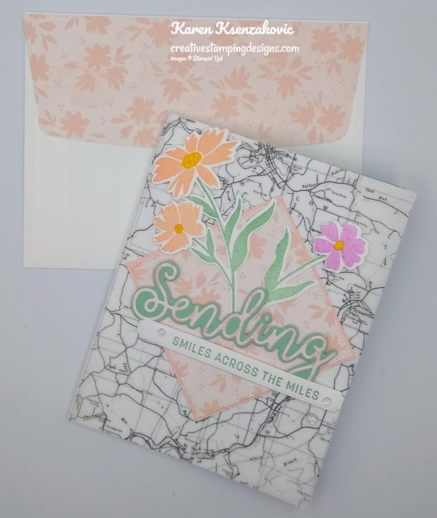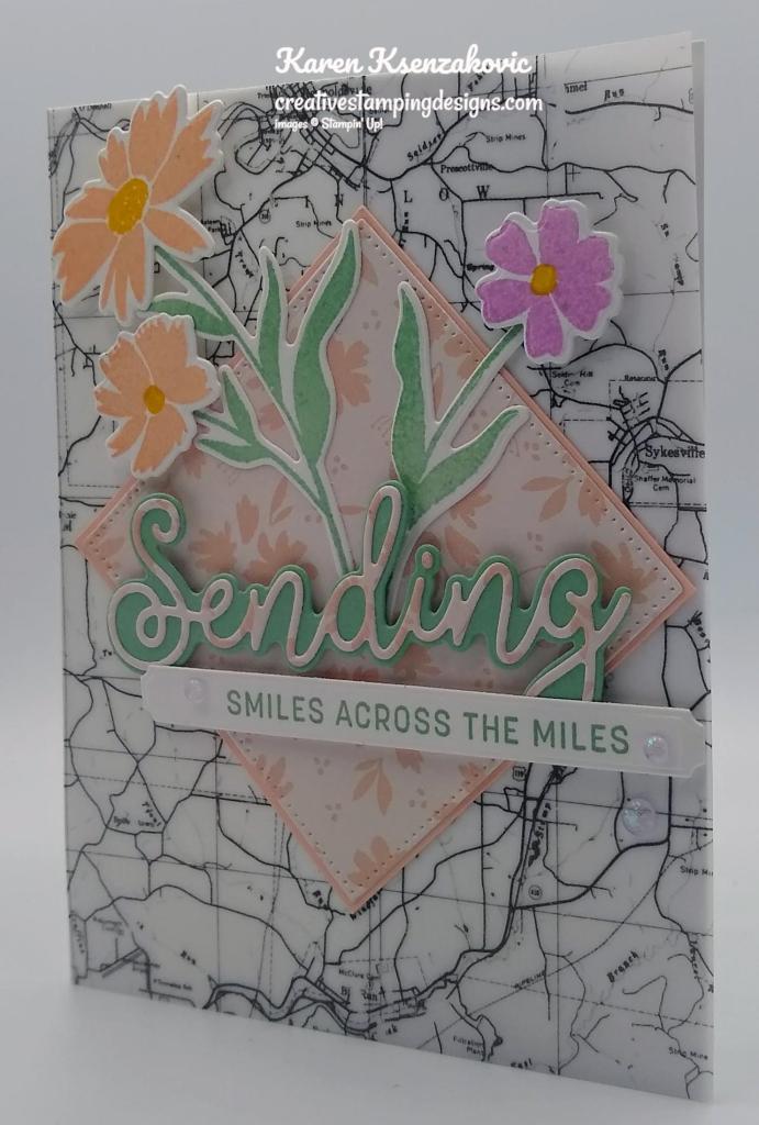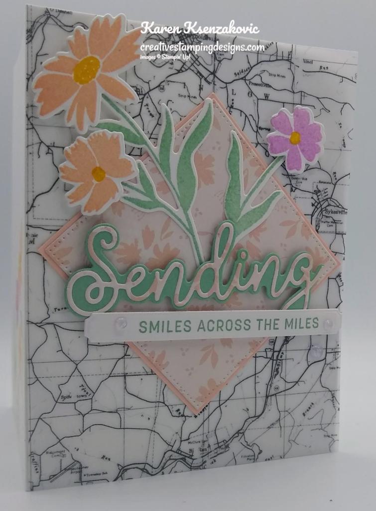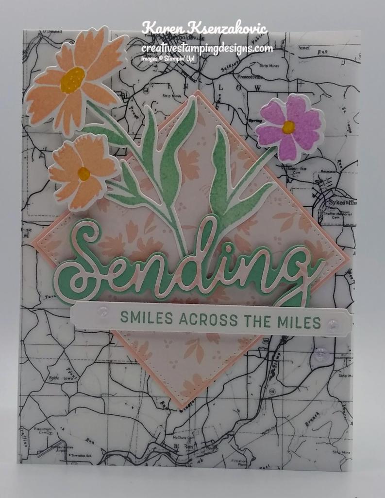 I adhered the detailed die to the mat using Liquid Glue. I adhered the die cut sentiment to the top of the card front using Stampin’ Dimensionals. I stamped the sentiment from the Sending Smiles stamp set in Sweet Sorbet Ink on a strip of Basic White. I cut the sentiment out using the Sending Dies. I adhered the sentiment to the bottom of the card front using Stampin’ Dimensionals. I added a few Adhesive-Backed Hearts & Flowers to the card front.