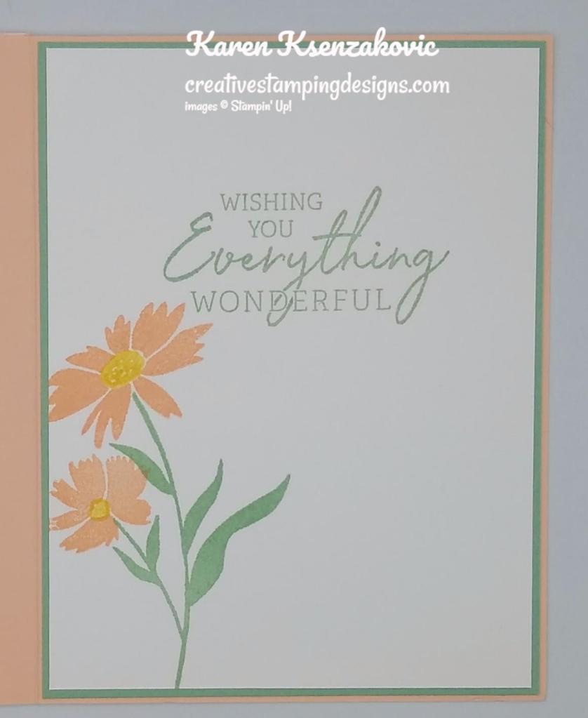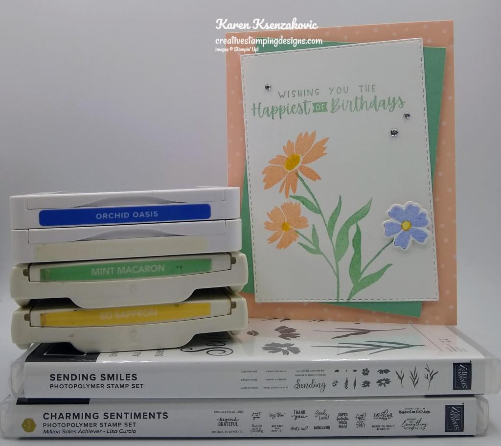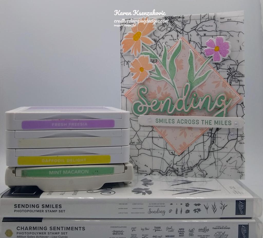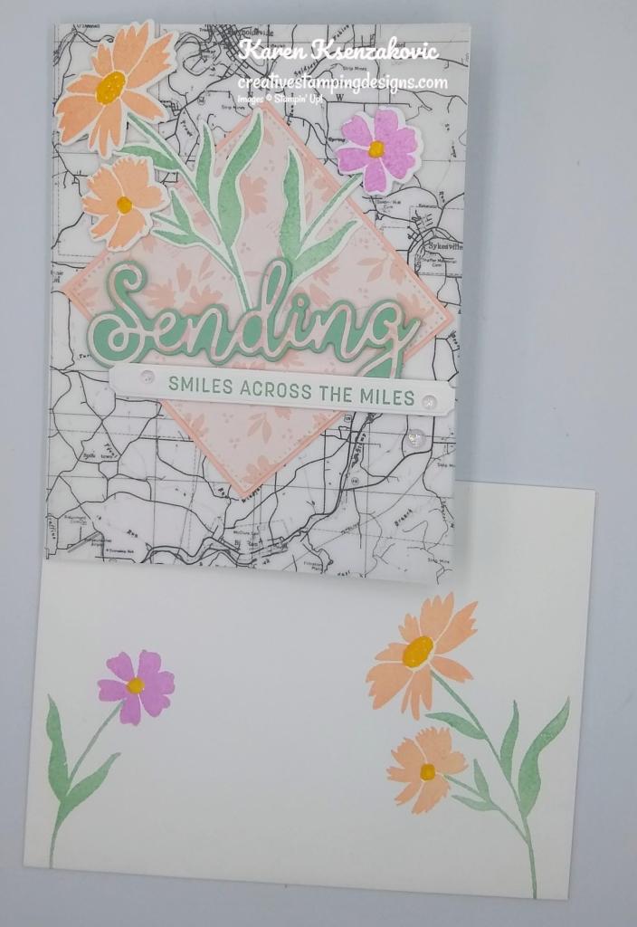 I adhered the detailed die to the mat using Liquid Glue. I adhered the die cut sentiment to the top of the card front using Stampin’ Dimensionals. I stamped the sentiment from the Sending Smiles stamp set in Sweet Sorbet Ink on a strip of Basic White. I cut the sentiment out using the Sending Dies. I adhered the sentiment to the bottom of the card front using Stampin’ Dimensionals. I added a few Adhesive-Backed Hearts & Flowers to the card front.