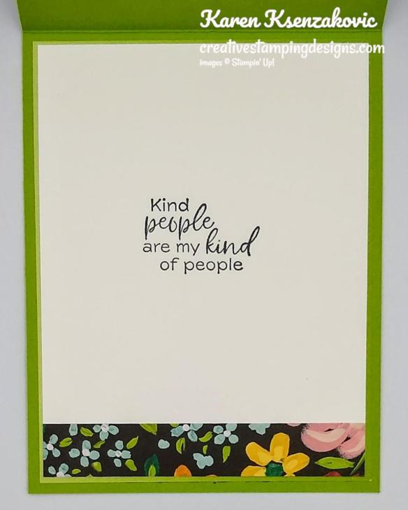 On the inside I stamped the sentiment from the Simply Succulents stamp set in Evening Evergreen Ink on a Basic White panel. I adhered a strip of the Bloom Where you’re Planted DSP to the bottom of the panel using Stampin’ Seal. I adhered the Basic White panel to a Polished Pink mat using Stampin’ Seal and then to the inside of the Gray Granite card base using Multipurpose Liquid Glue.