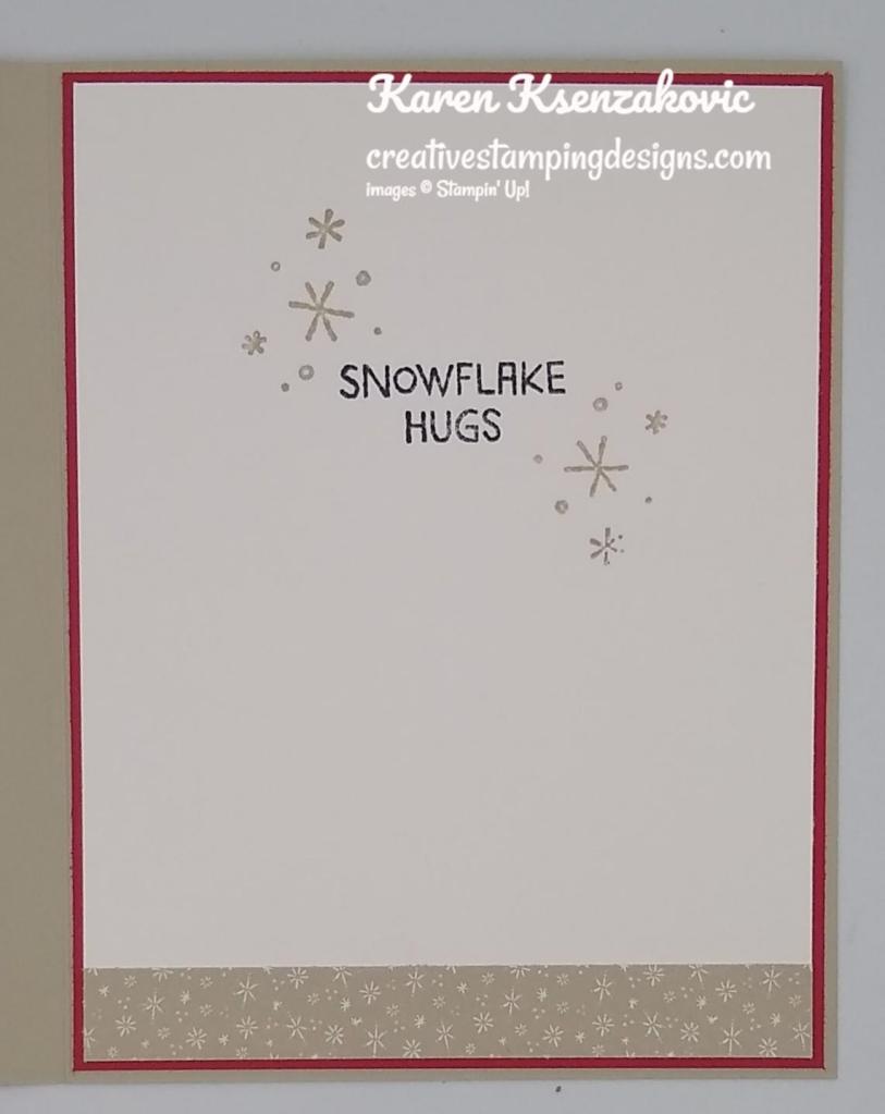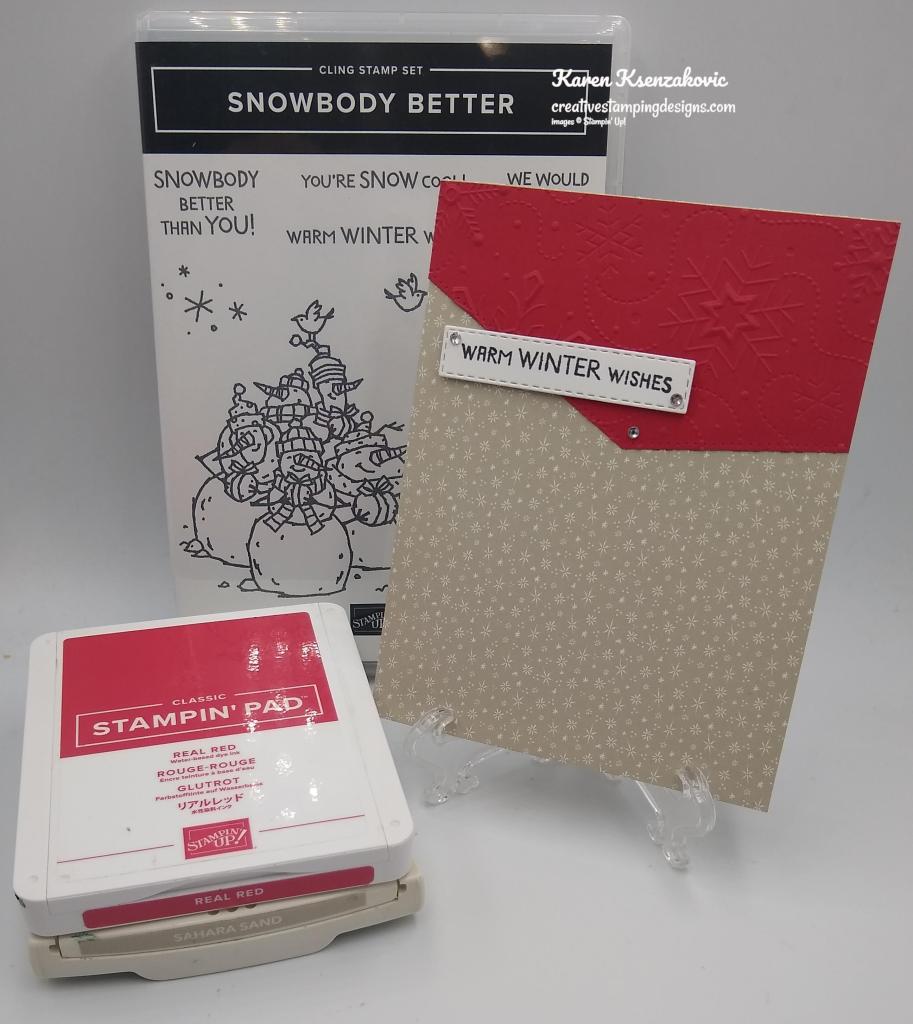 I used the Stampin’ Up! Snowbody Better Cling Stamp Set along with the Tidings of Christmas 6 X 6 Designer Series Paper for my card today.