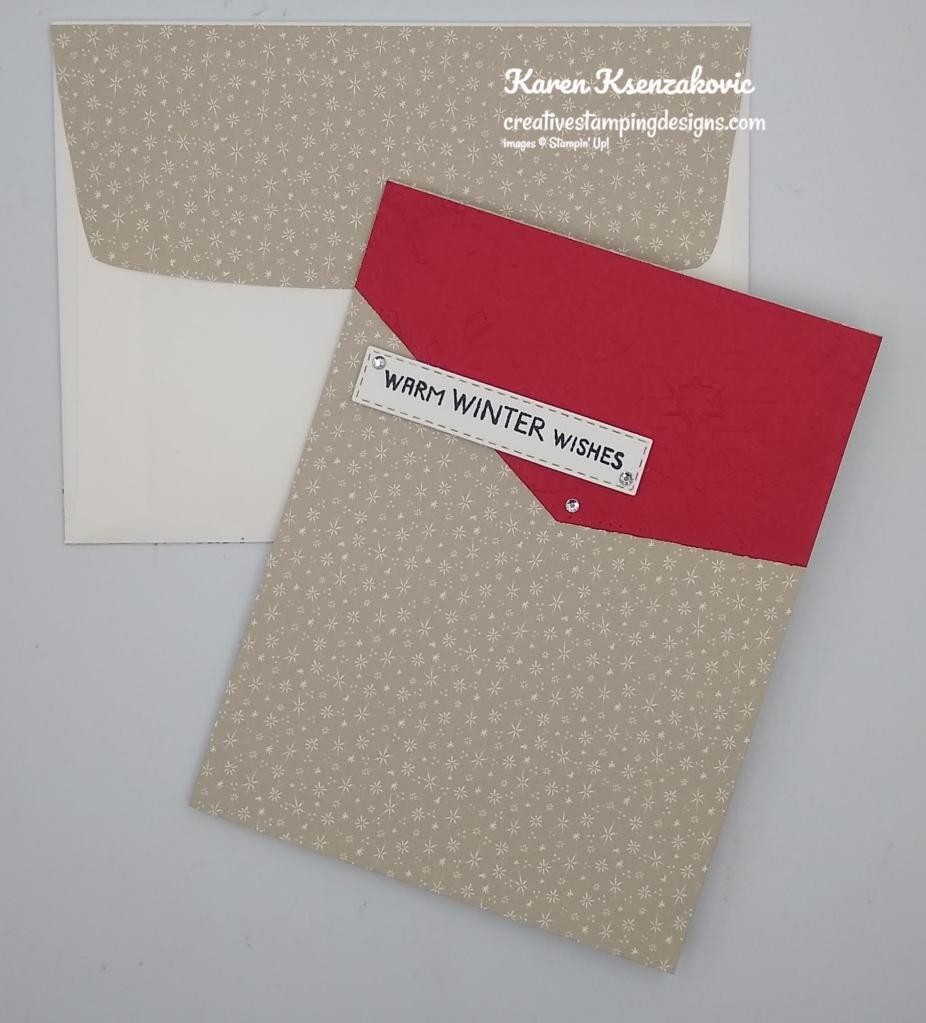 To finish my card, I decorated a Basic Whtie Medium Envelope. I adhered a strip of the Tidings of Christmas DSP to the envelope front and a panel to the envelope flap.