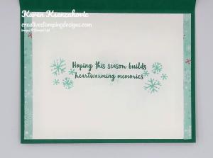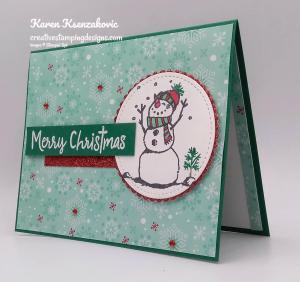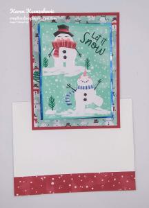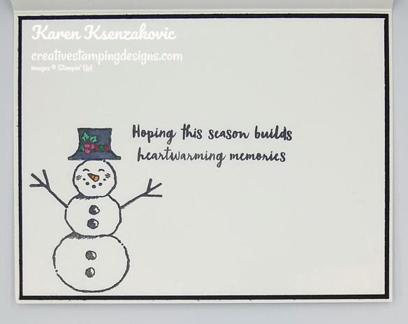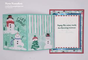 On the front of the Z-Fold I adhered 2 of the fussy cut snowmen using Multipurpose Liquid Glue. I stamped the sentiment from the Stampin’ Up! Snowman Season Photopolymer Stamp Set on the DSP in Shaded Spruce Ink. I immediately sprinkled it with Clear Stampin’ Emboss Powder and set it using my Heat Tool. You can emboss any color when you use your ink and the Clear Stampin’ Emboss Powder. I just love the way an embossed sentiment looks, so I do this a lot.