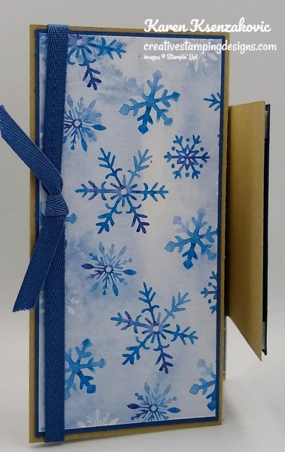 - Snowflake Splendor Designer Series Paper 2 1/2″ X 5 1/4″ (card front panel), 2 1/4″ X 6″ (piece for envelope flap)