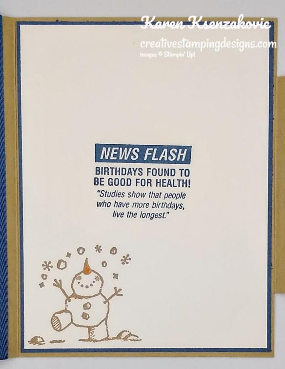 On the inside I stamped the sentiment from the Approaching Perfection stamp set in Misty Moonlight Ink in the center of a Whisper White panel. I stamped another one of the snowman images from the Snowman Season stamp set in Crumb Cake Ink on the bottom of the panel. I adhered the Whisper White panel to a Misty Moonlight mat using Stampin’ Seal and then to the Crumb Cake card base using Multipurpose Liquid Glue, over the small card base tab.