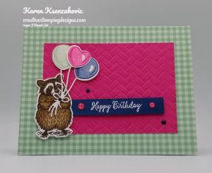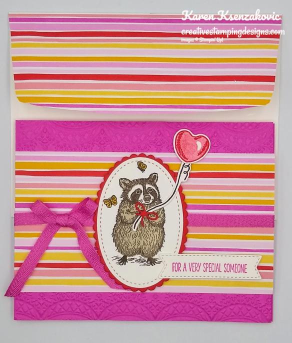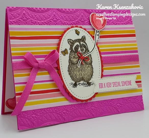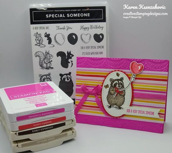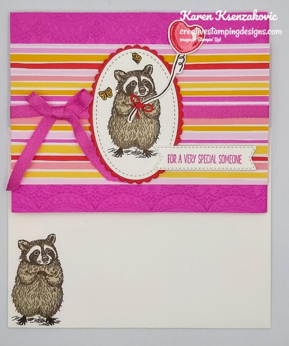 On a panel of Basic White cardstock I stamped the outline raccoon image from the Special Someone stamp set in Early Espresso Ink. I stamped the fill image in Sahara Sand Ink over the outline image. I stamped a couple of the butterflies from the Special Someone stamp set in Early Espresso Ink by the raccoon and colored them in using my Bumblebee Stampin’ Write Marker. I cut the racoon out using the Stitched Shapes Dies. On the same panel I stamped the heart balloon outline image from the Special Someone stamp set in Poppy Parade Ink. I stamped the heart balloon fill image over the outline image in Poppy Parade Ink, stamping off once. I stamped the string image in Early Espresso Ink. I cut the balloon and string out using the Special Day Dies. Using the Layering Ovals Dies I cut the scalloped oval from a panel of Poppy Parade cardstock. I adhered the raccoon image to the scalloped oval using Stampin’ Seal and adhered it to the card front over the ribbon using Stampin’ Dimensionals. I adhered the balloon to the string using a Glue Dot and adhered it to the raccoon using a Glue Dot. I had cut a tiny bow from a scrap of Poppy Parade using the Special Day Dies and adhered it to the string by the raccoons paws using a Glue Dot.