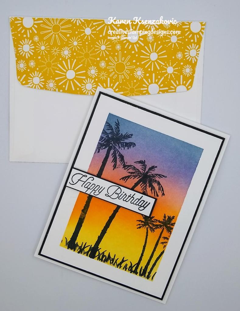 - Sunshine & Rainbows 6 X 6 Designer Series Paper 2 1/4″ X 5 1/4″ (card front), 2 – 3″ X 6″ (different patterns cut into 1/2″ strips), 2 1/4″ X 6″ (envelope flap)