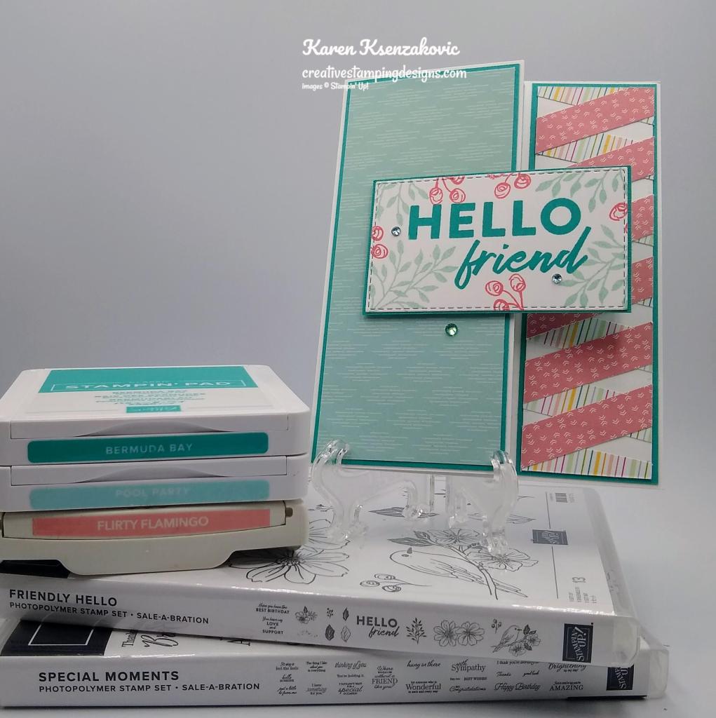 I used the Stampin’ Up! Sale-a-bration Friendly Hello Photopolymer Stamp Set along with the Stampin’ Up! Sale-a-bration Special Moments Photopolymer Stamp Set and the Sunshine & Rainbows 6 X 6 Designer Series Paper for my card today.