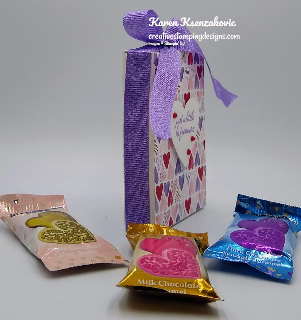 The box will hold 2 of the Ghirardelli Heart candies without bulging. I closed the box and wrapped a piece of Highland Heather 1/2″ Grosgrain Ribbon around the box and tied a bow on the top.