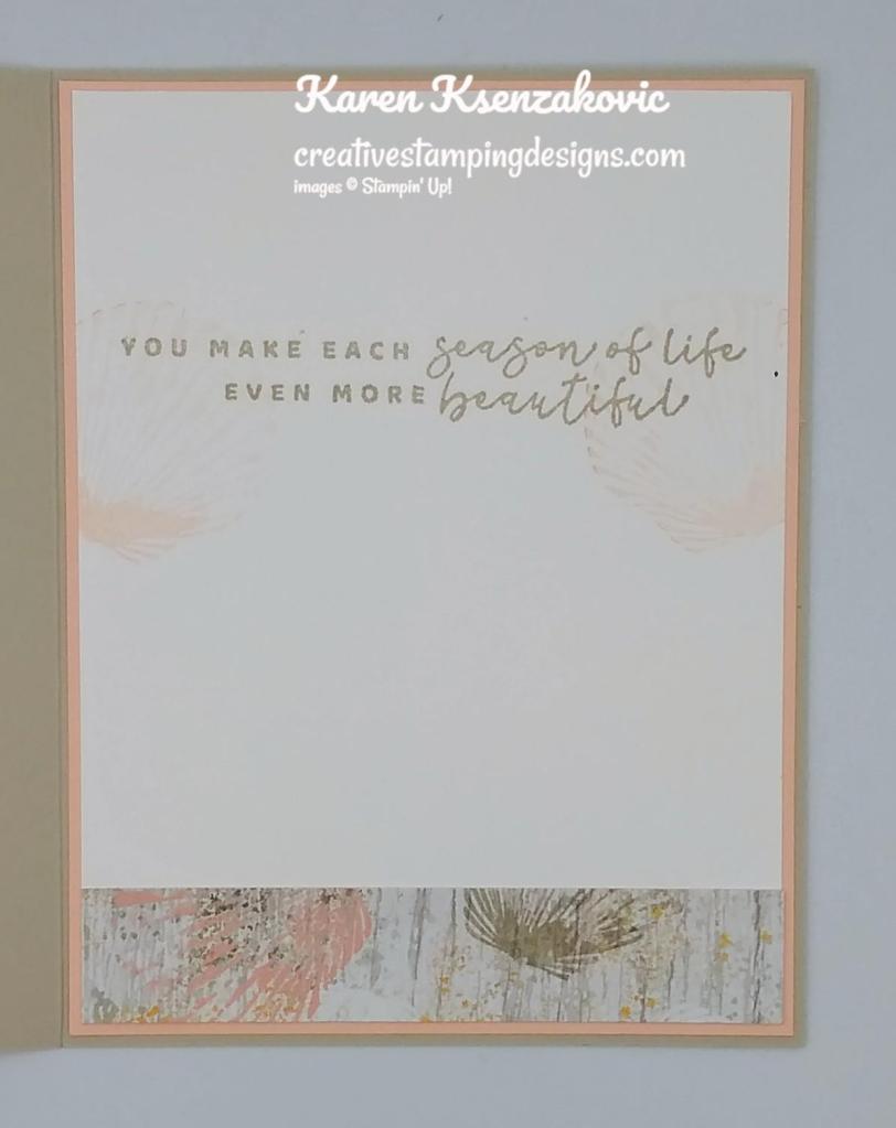 On the inside, I stamped the sentiment from the Seasonal Branches stamp set in Lost Lagoon Ink on a panel of Basic White. I stamped the branch image from the Seasonal Branches stamp set on the bottom of the panel in Pecan Pie Ink. I stamped the single flower image from the Seasonal Branches stamp set in Petal Pink Ink on the branch. I stamped the bird image in Tuxedo Black Ink on the branch. I colored the bird using my Calypso Coral and Gray Granite Stampin’ Blends Markers. I adhered the Basic White panel to a Pool Party mat then to the inside of the Lost Lagoon card base.