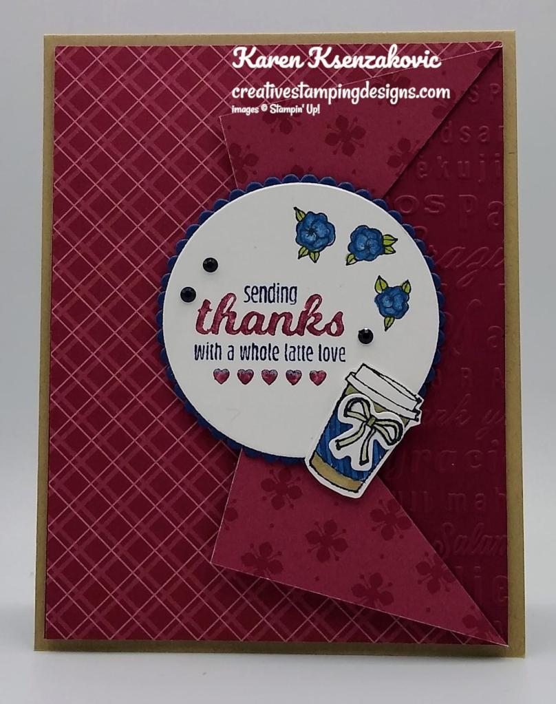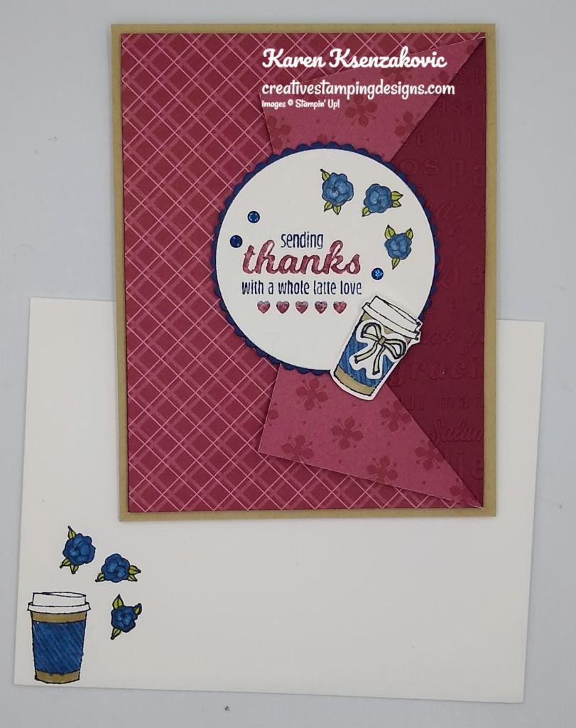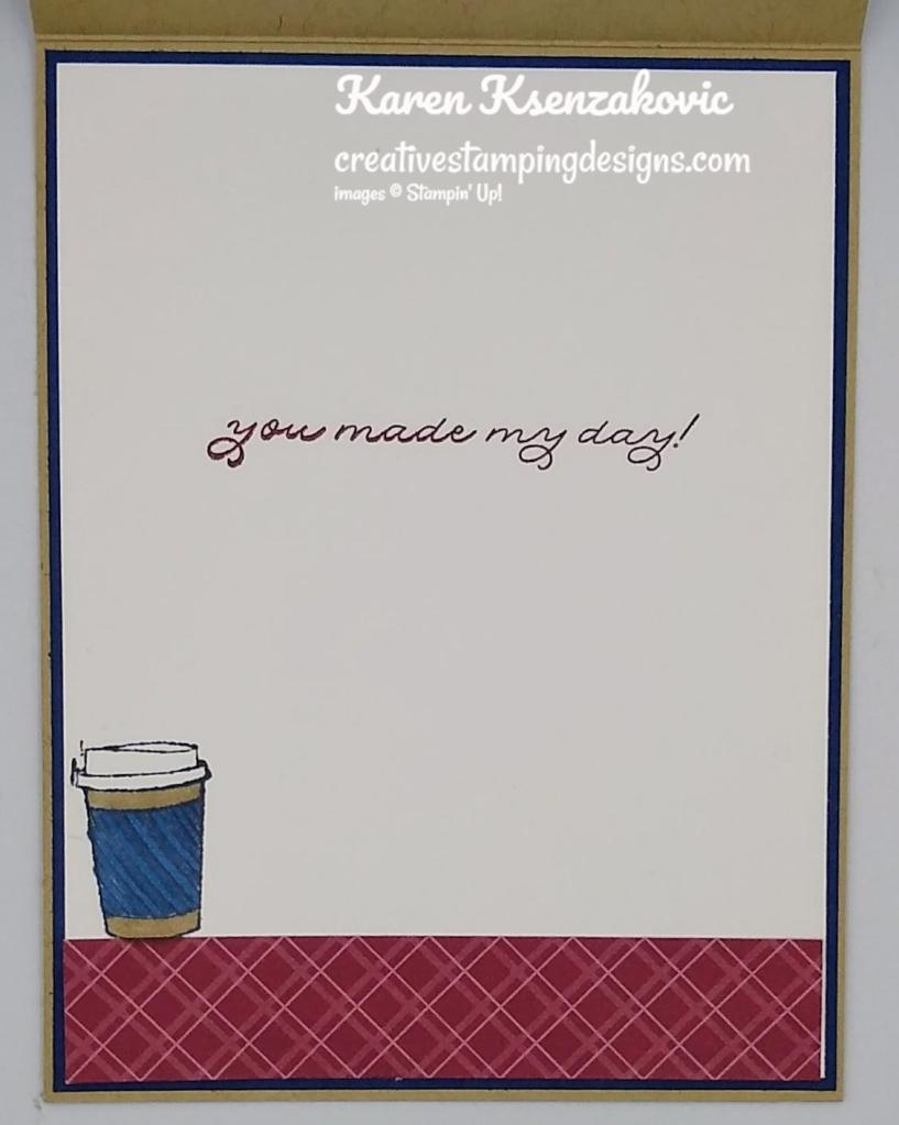 On the inside I stamped the sentiment from the Stampin’ Up! Ornate Thanks Photopolymer Stamp Set in Merry Merlot Ink on a Basic White panel. I adhered a strip of the Neutrals DSP to the bottom of the panel. I stamped the coffee cup on the bottom of the panel and colored it in using my Crumb Cake and Night of Navy Stampin’ Blends Markers. I adhered the Basic White panel to a Night of Navy mat and then to the inside of the Crumb Cake card base.