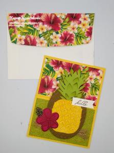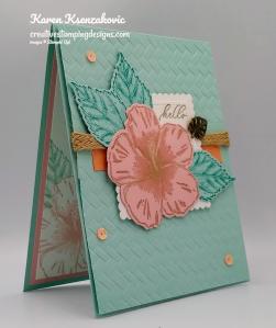 To finish my card I decorated a Basic White Medium Envelope. I stamped the hibiscus and the leaves from the Timeless Tropical stamp set in Tuxedo Black Ink on the envelope front. I colored the images in using my Just Jade and Polished Pink Stampn’ Blends Markers. I adhered a panel of the Just Jade 2020-2022 6 X 6 In-Color Designer Series Paper to the envelope flap.