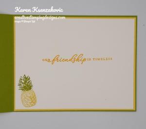 On the inside I stamped the sentiment from the Timeless Tropical stamp set in Tuxedo Black Ink in the center of a Basic White panel. I stamped the leaf image from the Timeless Tropical stamp set on the sides of the panel and colored them in using my Just Jade Stampin’ Blends Markers. I adhered the Basic White panel to a Just Jade mat using Stampin’ Seal and then to the inside of the Basic White card base using Stampin’ Seal.