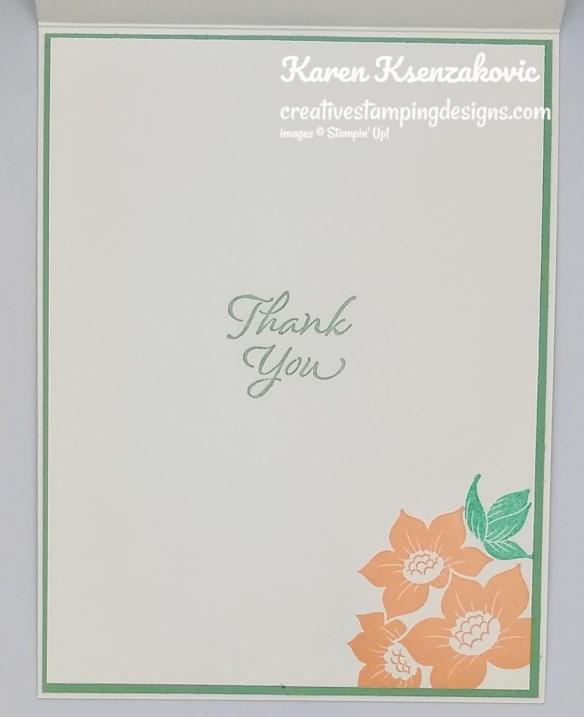 On the inside I stamped the sentiment from the Stampin’ Up! Strong & Beautiful Stamp Set in Tuxedo Black Ink in the center of a Basic White panel. I stamped the flower image from the Tranquil Thoughts stamp set in Flirty Flamingo Ink on the bottom of the panel. I adhered the Basic White panel to a Flirty Flamingo mat using Stampin’ Seal and then to the inside of the Flirty Flamingo card base using Stampin’ Seal.