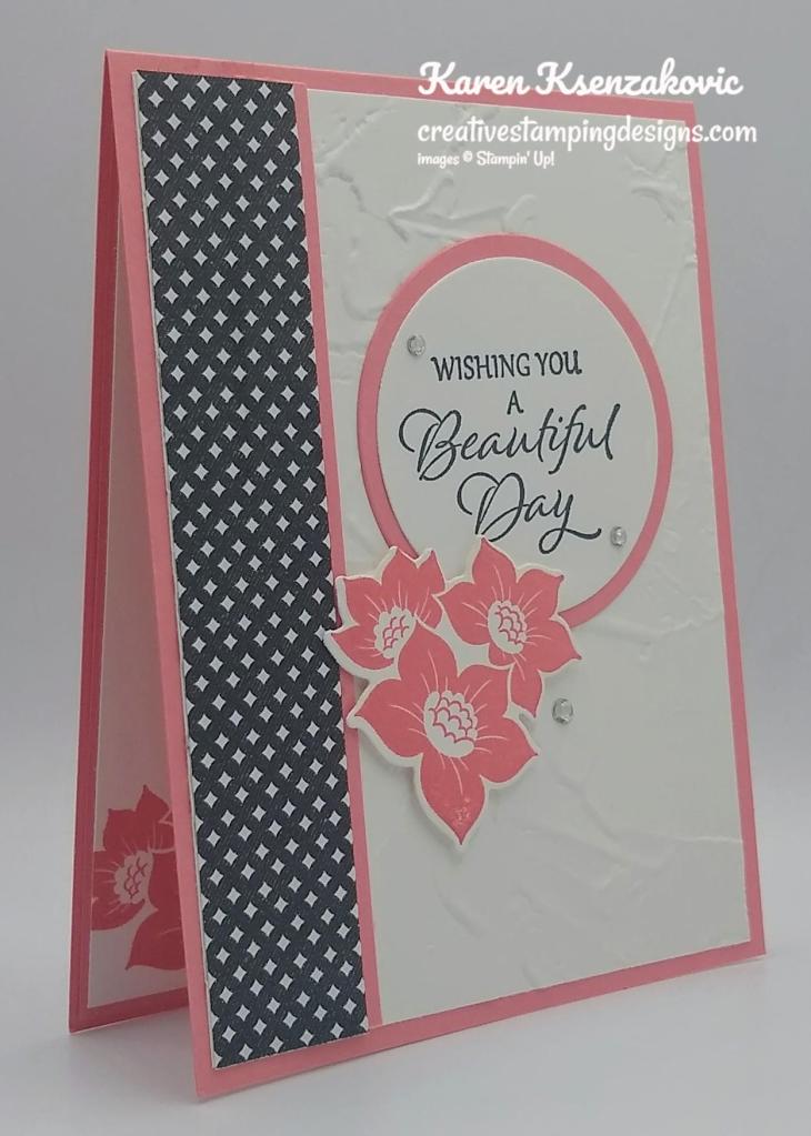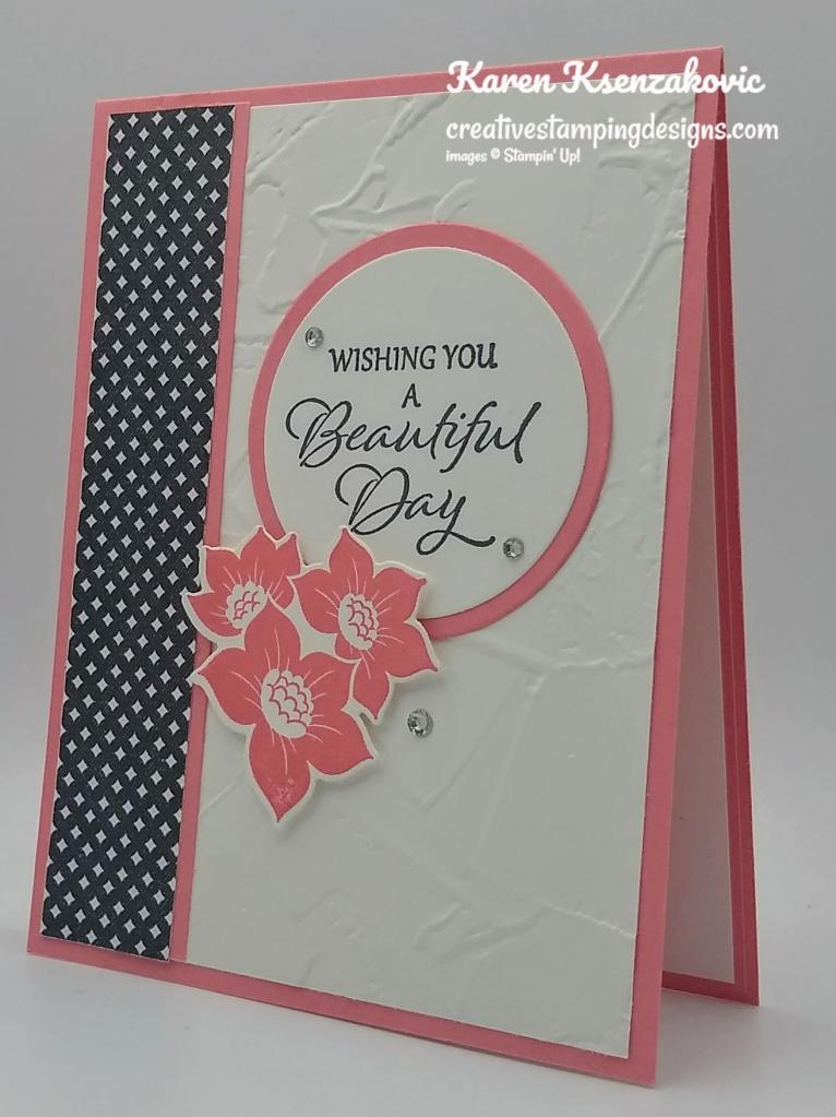 Today’s card is another we made at our class last Monday. This one was a little different. I didn’t show the ladies the card. I handed them an envelope with all the card pieces cut out and gave them 2 stamp sets to choose from to work with and told them to create. One of them had Poppy Parade cardstock and ink and the other had Melon Mambo cardstock and ink. I used Flirty Flamingo for mine. Everyone had the same pieces of True Love Designer Series Paper to use. Unfortunately I forgot to take pictures of the card designs they came up with. None were like mine. Here’s my card for today.