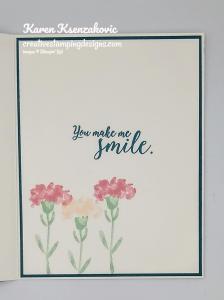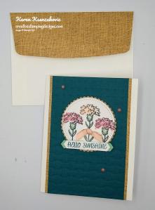 On the inside I stamped the top sentiment from the Stampin’ Up! Well Said Cling Stamp Set in Early Espresso Ink. I stamped the bottom sentiment from the Stampin’ Up! So Sentimental Cling Stamp Set in Early Espresso Ink. I stamped just the top of the birds nest from the Birds & Branches stamp set in Crumb Cake Ink on the bottom of the panel. I stamped the 2 bird images from the Birds & Branches stamp set the same as I did for the front of the card. I had stamped extra eggs from the Birds & Branches stamp set in Seaside Spray Ink and cut them out using the Birds & More Dies, so I added one to the bottom of the panel. I adhered the Whisper White panel to a Crumb Cake mat using Stampin’ Seal and then to the inside of the Seaside Spray card base using Multipurpose Liquid Glue.