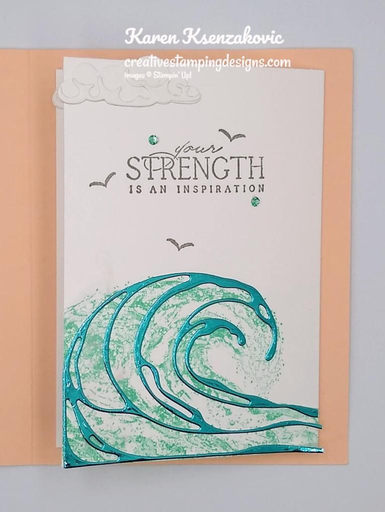 I adhered the 2 layered panels to the card front using Liquid Glue, I stamped the sentiment from the Country Bouquet stamp set in Versamark Ink on a panel of Basic White. I sprinkled it with Gold Embossing Powder and set it using the Heat Tool. I cut the sentiment out using the Waves Dies.