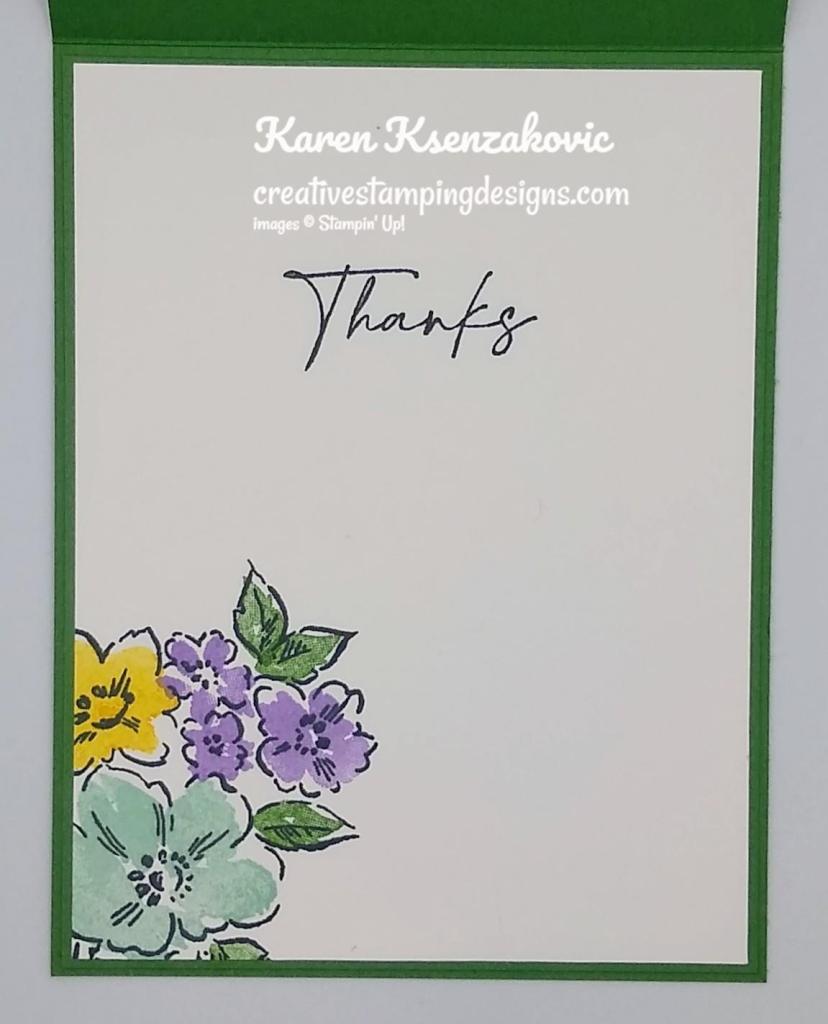 On the inside, I stamped the sentiment from the Country Bouquet stamp set in real Red Ink on a panel of Basic White. I stamped the open-heart images from the Country Bouquet stamp set in Flirty Flamingo Ink on the Basic White panel. I adhered the Basic White panel to a Flirty Flamingo mat then to the inside of the Real Red card base.
