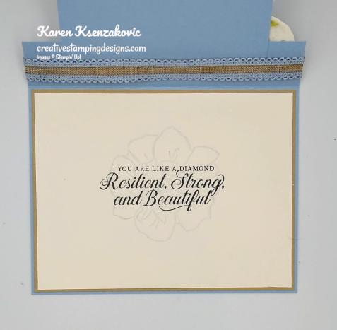 On the inside I stamped the sentiments from the Stampin’ Up! Path of Petals Photopolymer Stamp Set in Gray Granite Ink in the center of a Whisper White Panel. I stamped the leaf image from the Forever Fern stamp set in Soft Seafoam Ink on the bottom of the panel. I adhered the Whisper White panel to a Gray Granite mat using Stampin’ Seal and then to the inside of the Thick Whisper White card base using Multipurpose Liquid Glue.