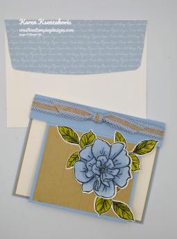 - Peony Garden Designer Series Paper 4 – 1 7/8″ X 5 1/4″ (card base panels), 2 1/4″ X 6″ (piece for envelope flap)