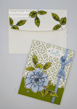 To finish my card I decorated a Medium Whisper White Envelope. I stamped the leaf image from the Forever Fern stamp set in Soft Seafoam on the envelope front once full strength and once stamped off. I adhered a panel of Peony Garden DSP to the envelope flap.