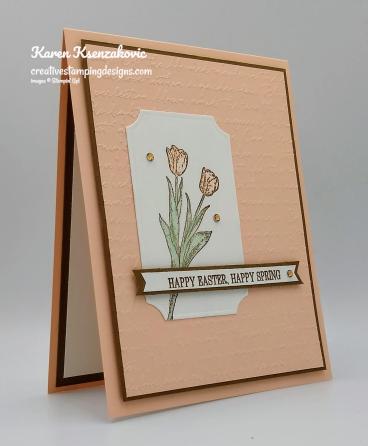 On a thin strip of Whisper White cardstock I stamped the sentiment from the Stampin’ Up! Timeless Tulips Photopolymer Stamp Set in Soft Suede Ink. I made the strip into a banner using my Paper Snips. I adhered the sentiment to a strip of Soft Suede cardstock, which I made into a banner using my Paper Snips, using Snail. I adhered the matted banner to the card front using Mini Stampin’ Dimensionals. I added a few Champagne Rhinestone Basic Jewels.