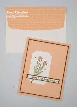 To finish my card I decorated a Medium Whisper White Envelope. I stamped the tulip image from the Winds of Change stamp set in Soft Suede Ink on the envelope front. I colored the image in using my Mint Macaron and Petal Pink Stampin’ Blends Markers. I adhered a Petal Pink panel of the Subtle 6 X 6 Designer Series Paper to the envelope flap.