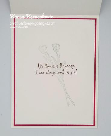 On the inside I stamped the sentiment from the Timeless Tulips stamp set in Soft Suede Ink in the center of a Whisper White panel. I stamped the tulip image from the Winds of Change stamp set in Petal Pink Ink over the sentiment. I adhered the Whisper White panel to a Soft Suede mat using Snail and then to the inside of the Petal Pink card base using Multipurpose Liquid Glue.