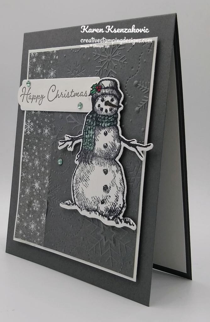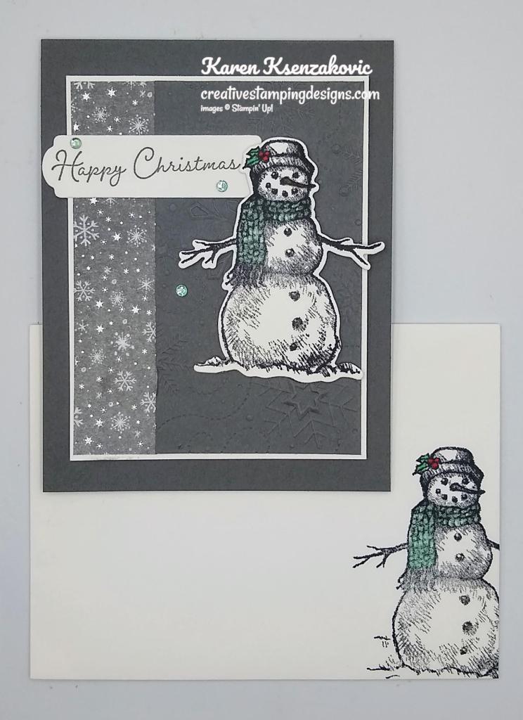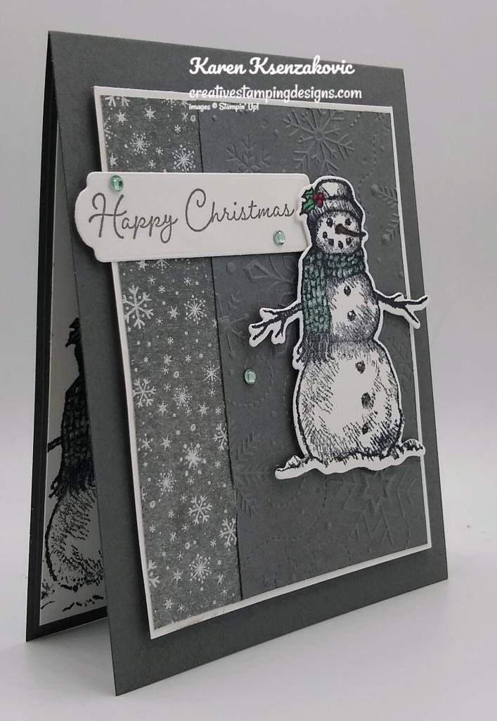 I used the Stampin’ Up! Snowbody Better Cling Stamp Set along with the Tidings of Christmas 6 X 6 Designer Series Paper for my card today.