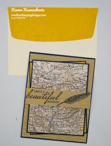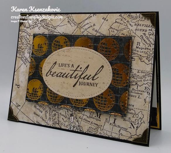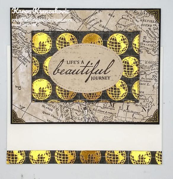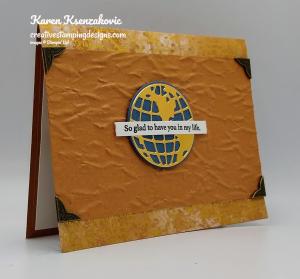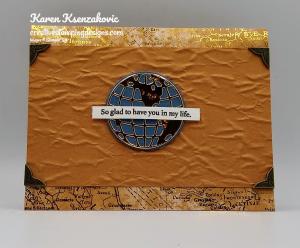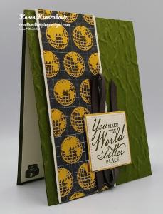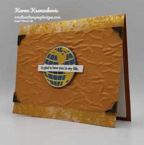 Using the World Map Dies I cut a globe stand from a panel of Brass Foil Sheet. I cut the globe from a panel of Cinnamon Cider cardstock and the detailed globe from a panel of Mossy Meadow cardstock. I adhered the detailed globe to the solid globe using Multipurpose Liquid Glue. I adhered the globe into the Brass Foil stand using Multipurpose Liquid Glue. I adhered the globe to the card front using Stampin’ Dimensionals.